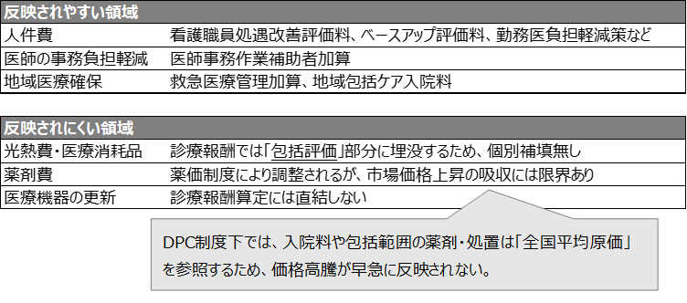 以上から、診療報酬改定は「病院経営の外部要因」として避けられないものであり、物価・人件費高騰への対応は 「診療報酬に組み込まれる領域」と「組み込まれない領域」 の二分化が進んでいることがわかります。経営者はその両面を的確に見極める必要があるのです。