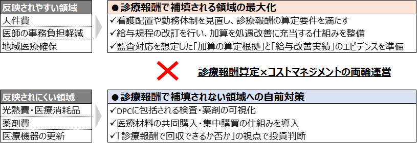 今後の改定を見据えた病院経営は、『算定可能な診療報酬はすべて算定する』、『算定で吸収できないコスト増については、内部努力によって徹底的に抑える』