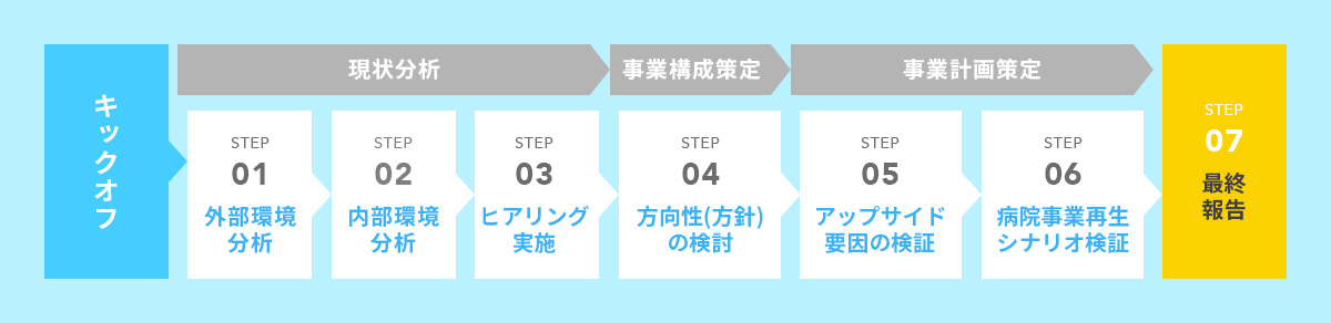 - STEP01~03の現状分析の結果に基づき、病院の目標・課題・アクションプランなど方向性を検討します。